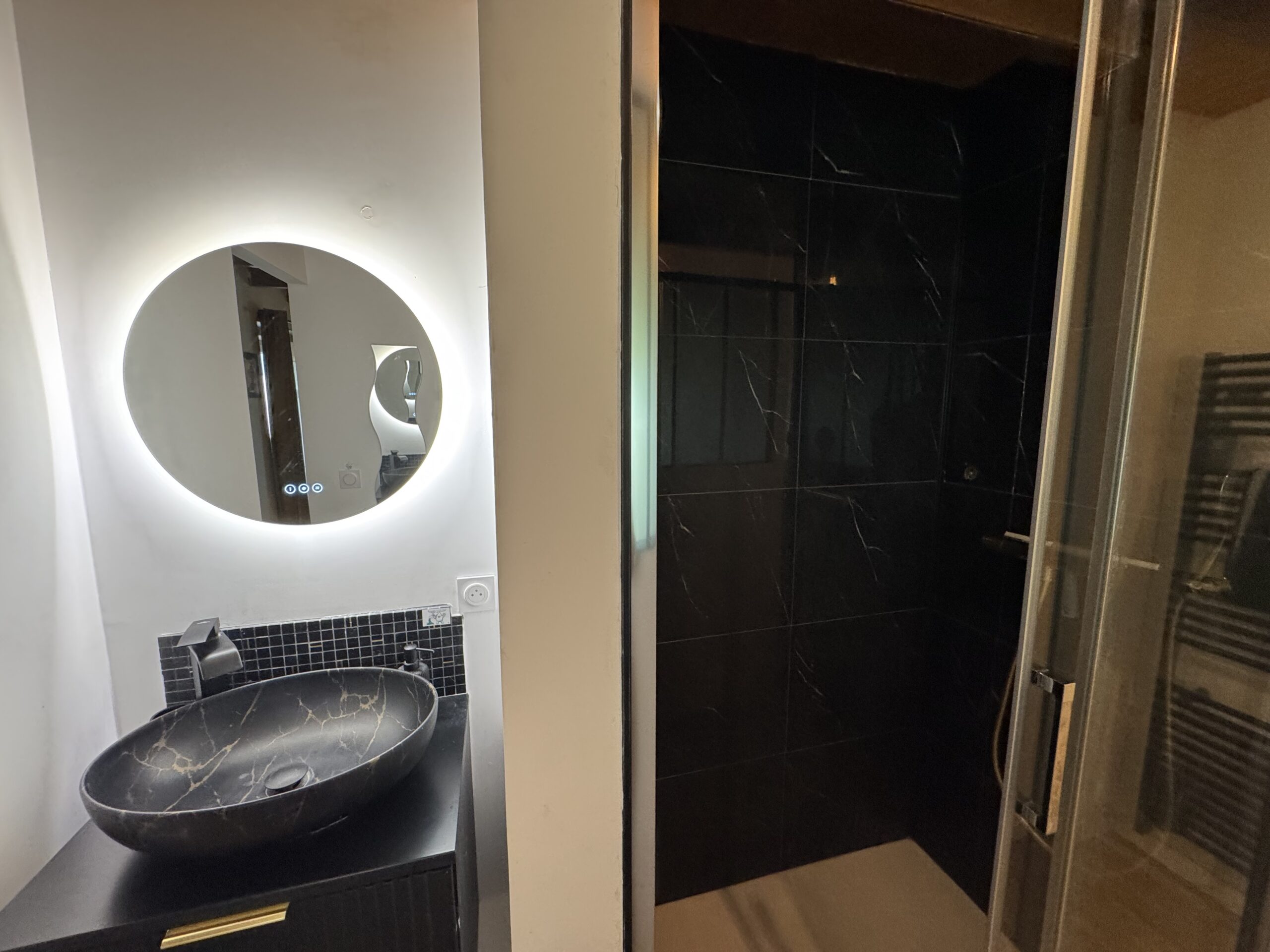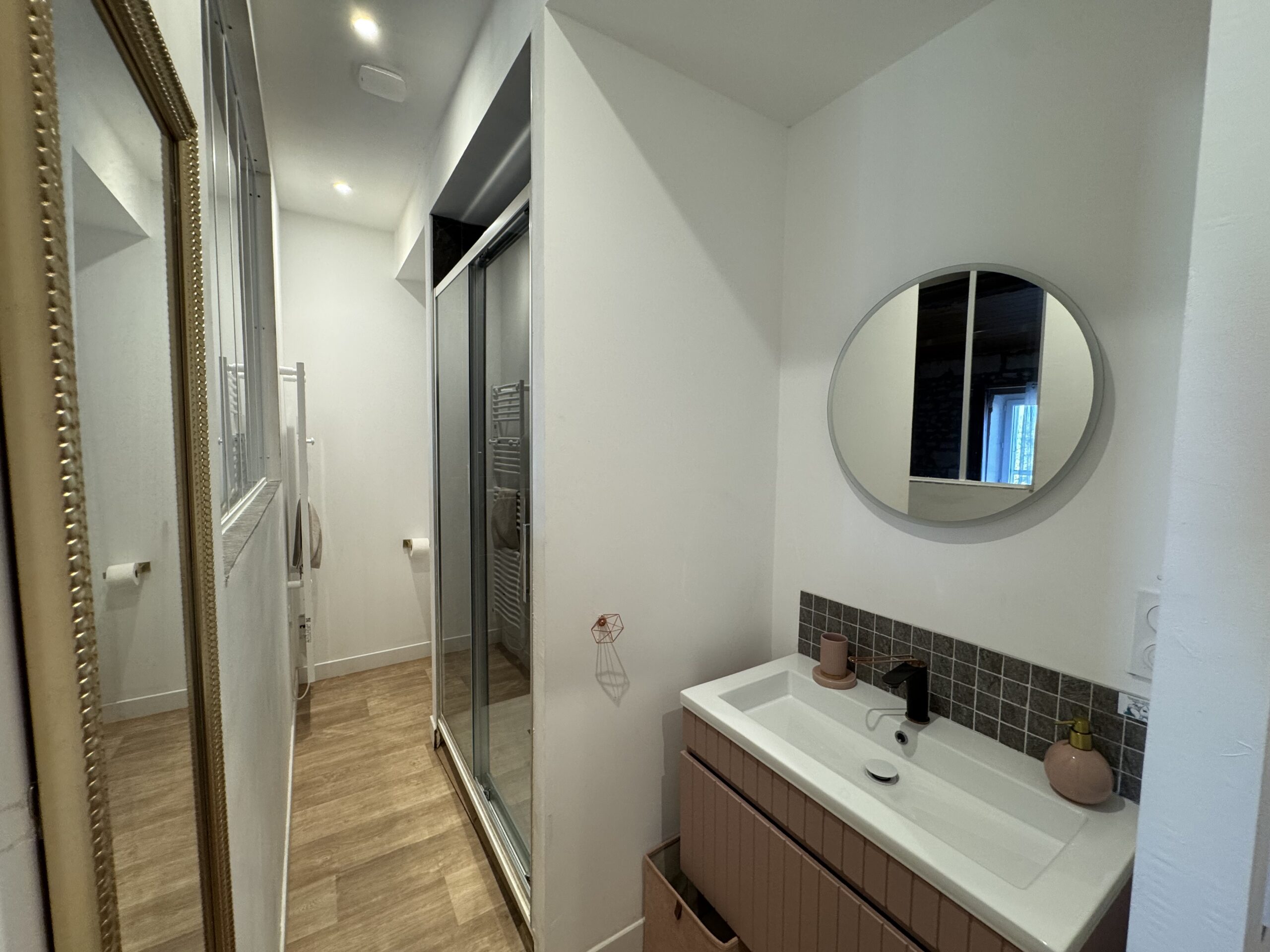 Située à l’étage, la suite dispose d’une salle d’eau privative comprenant une douche, un lavabo et des toilettes.