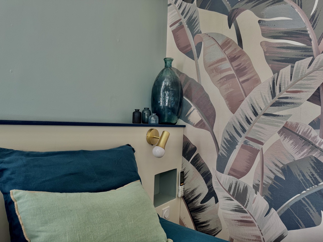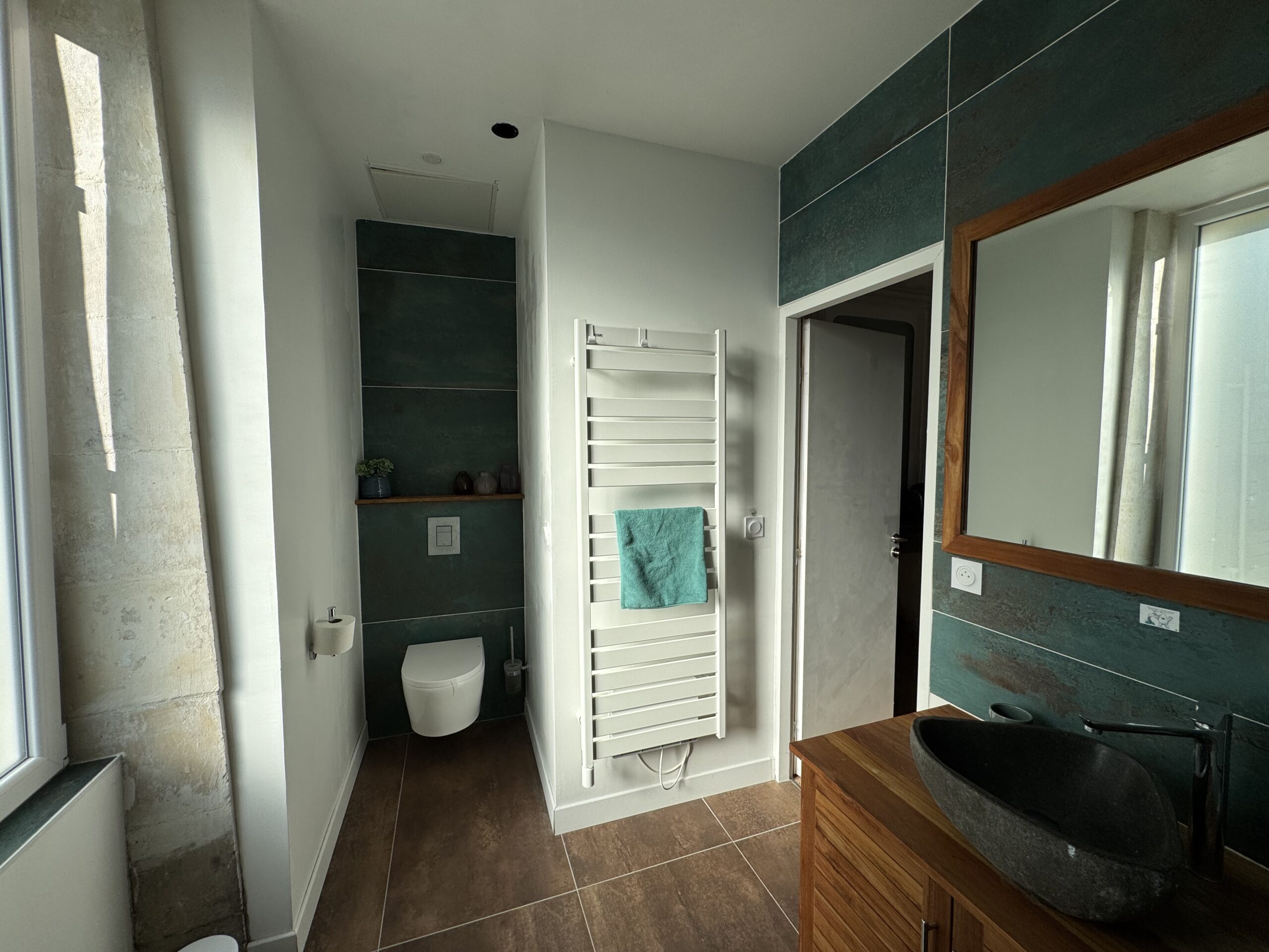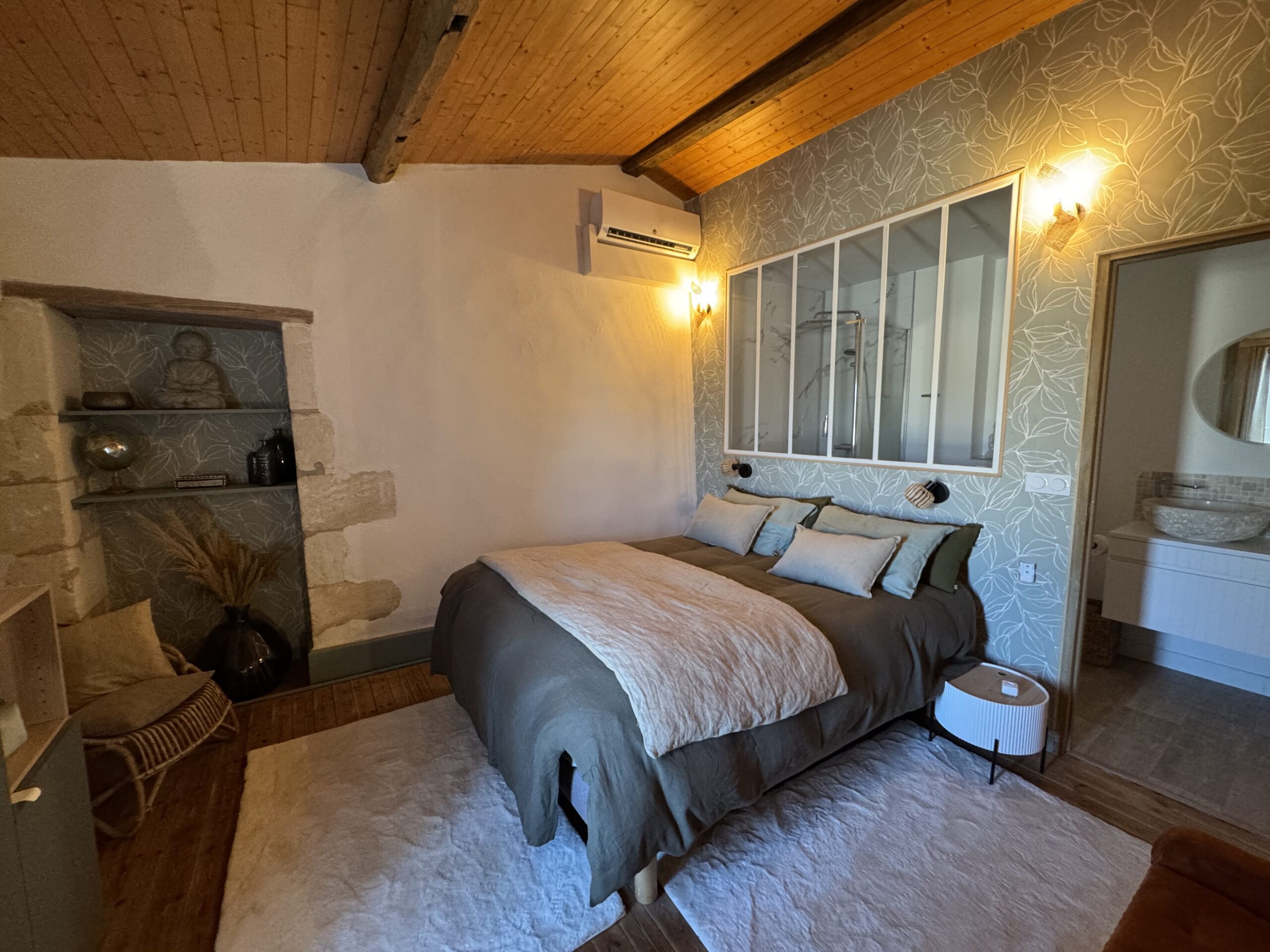 Ses teintes vertes, associées aux poutres en bois et au parquet naturel, créent une atmosphère chaleureuse et cocooning, idéale pour se détendre et se ressourcer.
