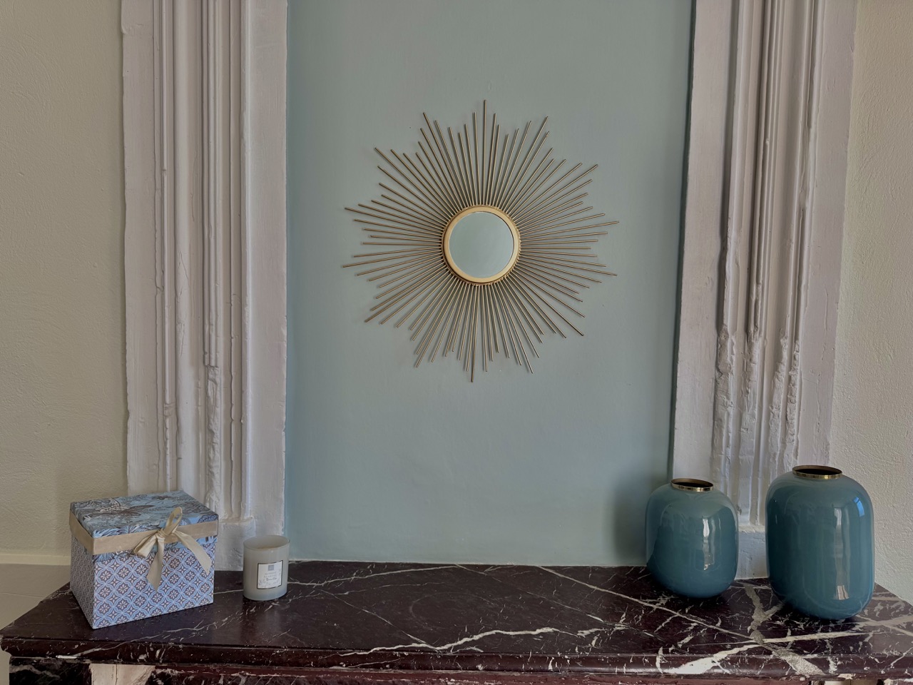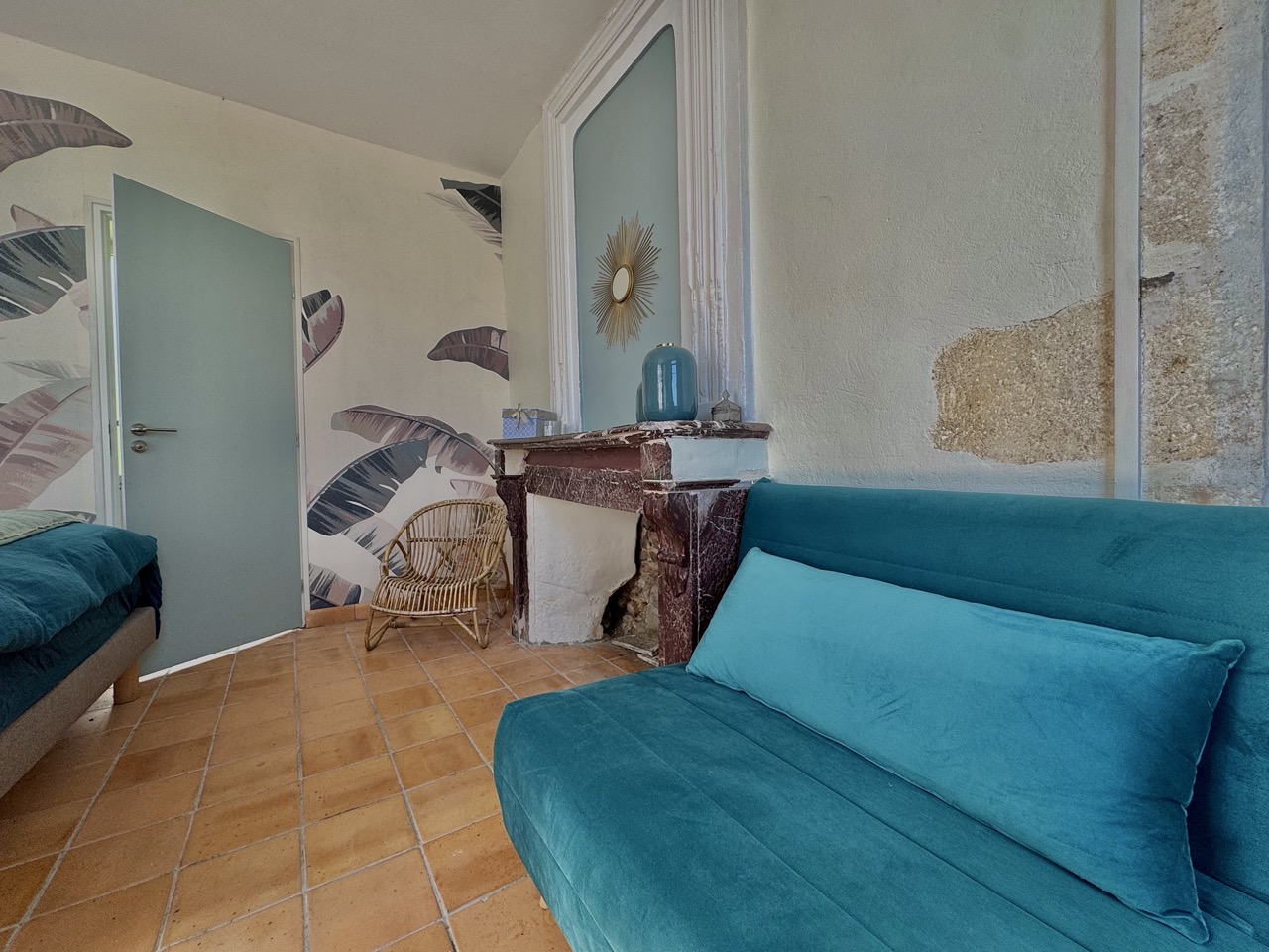 La cheminée d’époque, bien qu’inactive, apporte un charme authentique à la pièce.