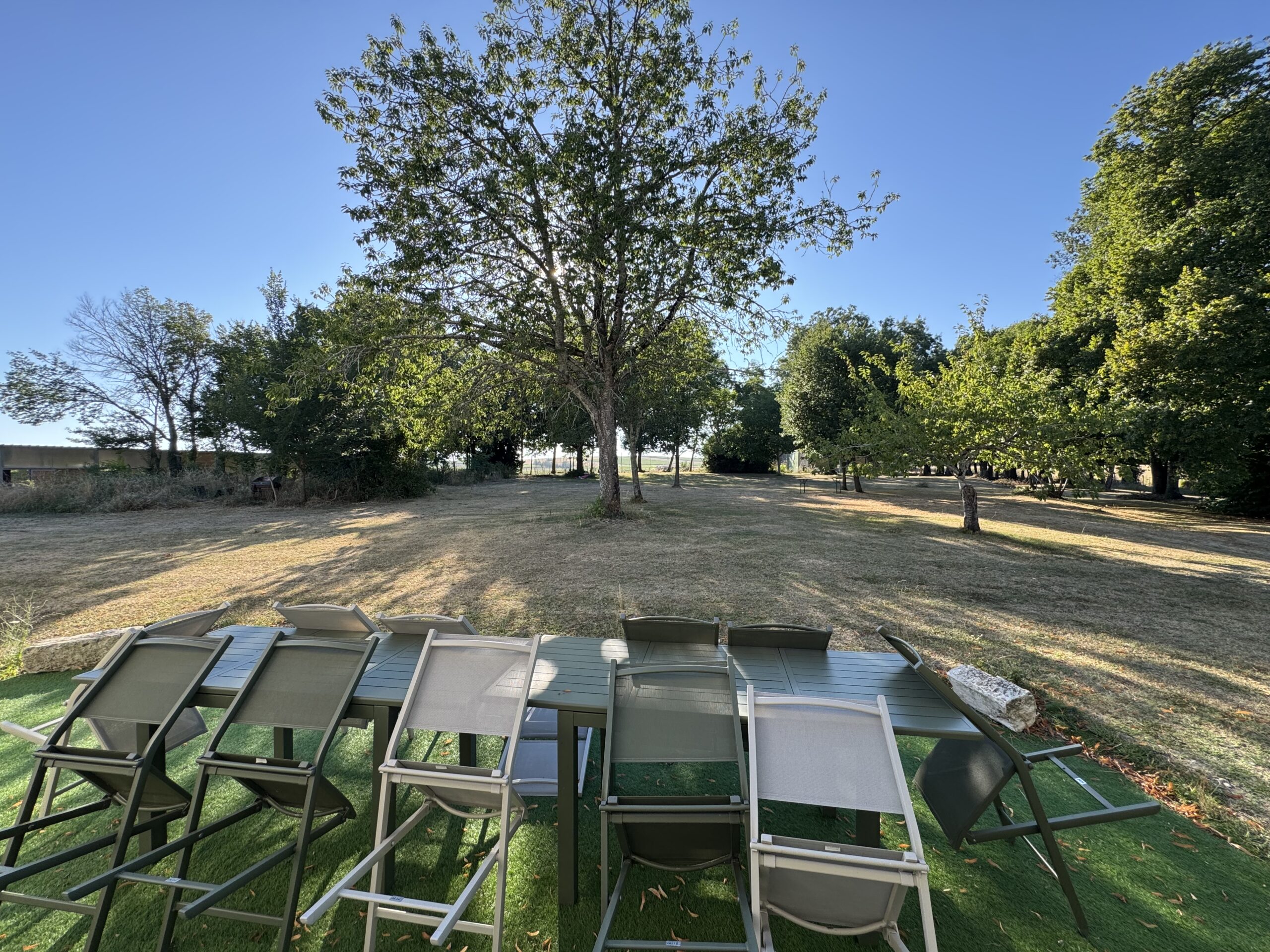 La cuisine accède à une terrasse privative de 35m², agrémentée de 2 tables de 6 personnes, de transats, d’un parasol, avec vue sur le boulodrome, un espace fruitier et boisé.